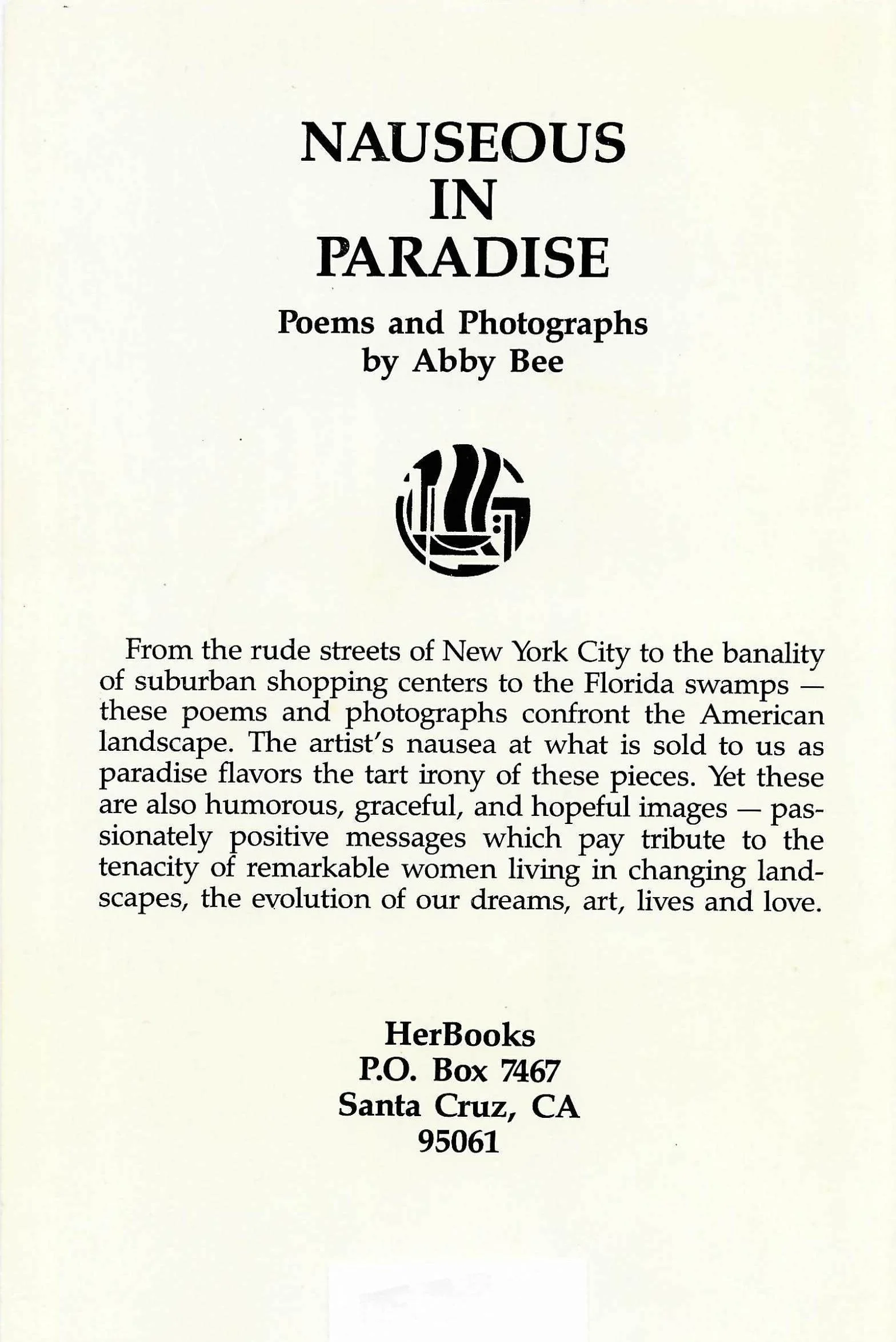 From the rude streets of New York City to the banality of suburban shopping centers to the Florida swamps — these poems and photographs confront the American landscape. The artist’s nausea at what is sold to us as paradise flavors the tart irony of these pieces. Yet these are also humorous, graceful, and hopeful images — passionately positive messages which pay tribute to the tenacity of remarkable women living in changing landscapes, the evolution of our dreams, art, lives and love.